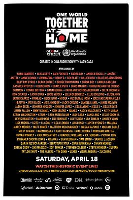 NBC、ABC、CBS将于4月18日联合举行的《同一个世界:共同在家》(One World: Together at Home)特别节目表演嘉宾包括张学友、陈奕迅、郎朗三位中国艺术家! 该节目由吉米法伦、吉米坎摩尔、史蒂芬寇贝尔联合主持。Lady Gaga策划该特别节目,首波嘉宾包括阿兰妮斯莫利塞特、安德烈波切利、Billie Eilish、Green Day乐队、克里斯马汀、大卫贝克汉姆、艾迪韦德、埃尔顿约翰、菲尼亚斯奥康奈尔、伊德里斯艾尔巴夫妇、J Balvin、约翰传奇、凯茜马斯格雷夫斯、凯斯厄本、凯丽华盛顿、郎朗、Lizzo、Maluma、保罗麦卡特尼、佩丽冉卡曹帕拉、沙鲁克汗、斯蒂夫旺达。 第二波表演嘉宾包括Taylor Swift、Celine Dion、Shawn Mendes、Camila Cabello、詹妮弗洛佩兹、Alicia Keys、Sam Smith、Usher、Pharrell Williams、奥普拉温弗瑞、艾伦德杰尼勒斯、奥卡菲娜、艾米波勒、LL Cool J、露皮塔尼永奥、马修麦康纳、维多利亚贝克汉姆。 该节目将教育并告知观众新冠病毒的风险、预防及应对措施,由来自音乐、艺术、体育、喜剧界的明星担任嘉宾,并将采访世界卫生组织的专家以及前线的医护人员。 ...